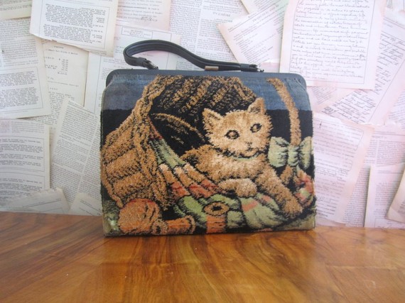 These pictures are of the same bag: Large Vintage 1940s MARLOW Carpet Bag with horse and kittens on both sides! from sassysistervintage